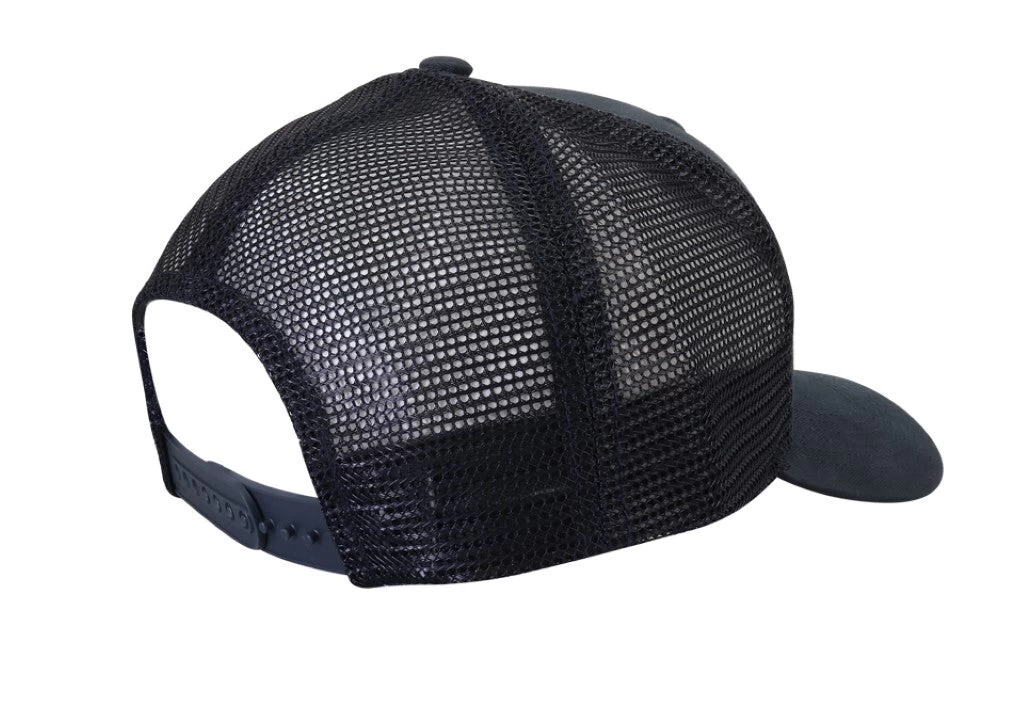 This one size fits most cap is made with a navy brushed twill fabric front and navy mesh back with plastic snap closure.
