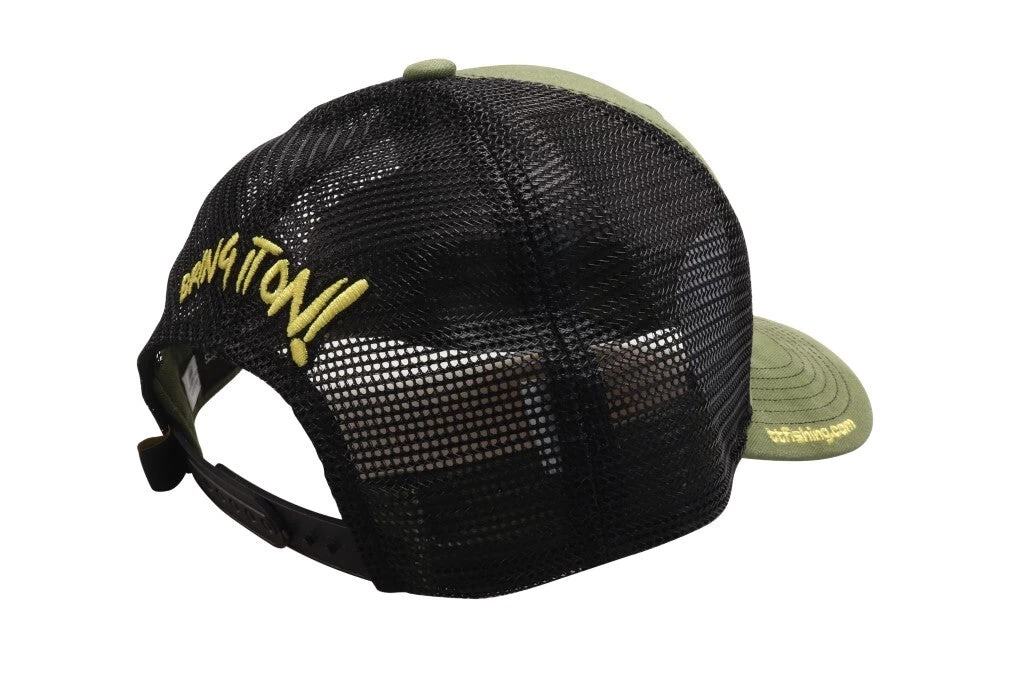 The TT Fishing premium structured trucker cap has a large embroidered TT logo on the front, the “Bring it On!” slogan embroidered on the back, a woven TT logo tag by the snap closure, and an embroidered “ttfishing.com” along the side of the brim.