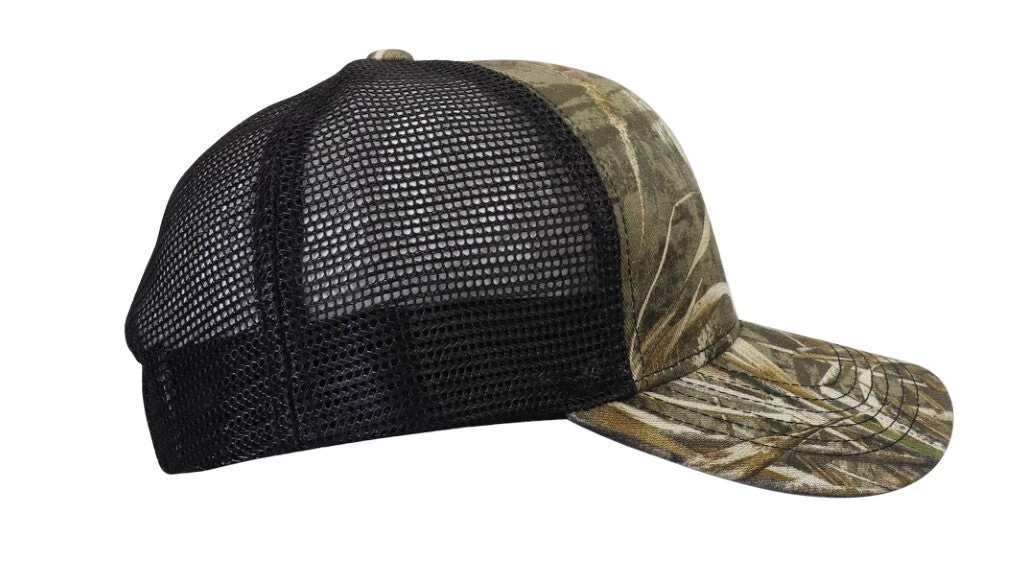 This one size fits most cap is made with a brushed twill fabric and black mesh back with plastic snap closure.