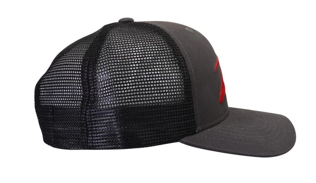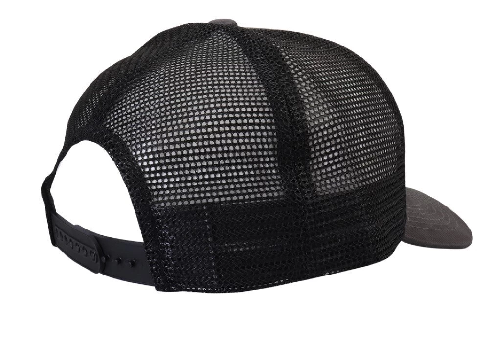 This one size fits most cap is made with a charcoal brushed twill fabric front and black mesh back with plastic snap closure.