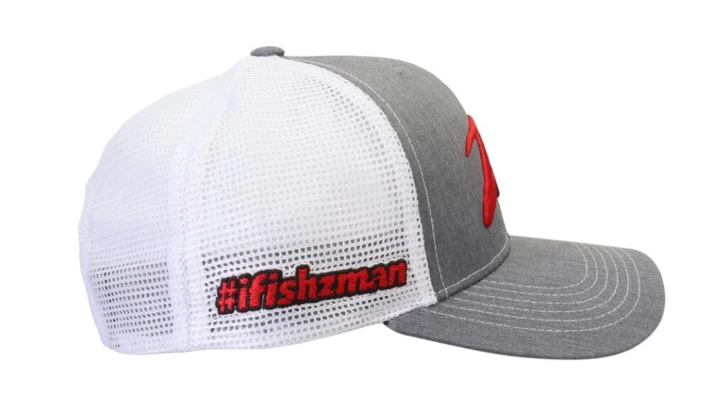 The ZMan premium structured trucker cap has a large embroidered ZMan logo on the front, an embroidered “Z” on the back, a woven “Z” tag by the snap closure, and an embroidered #ifishzman on the side of the mesh.